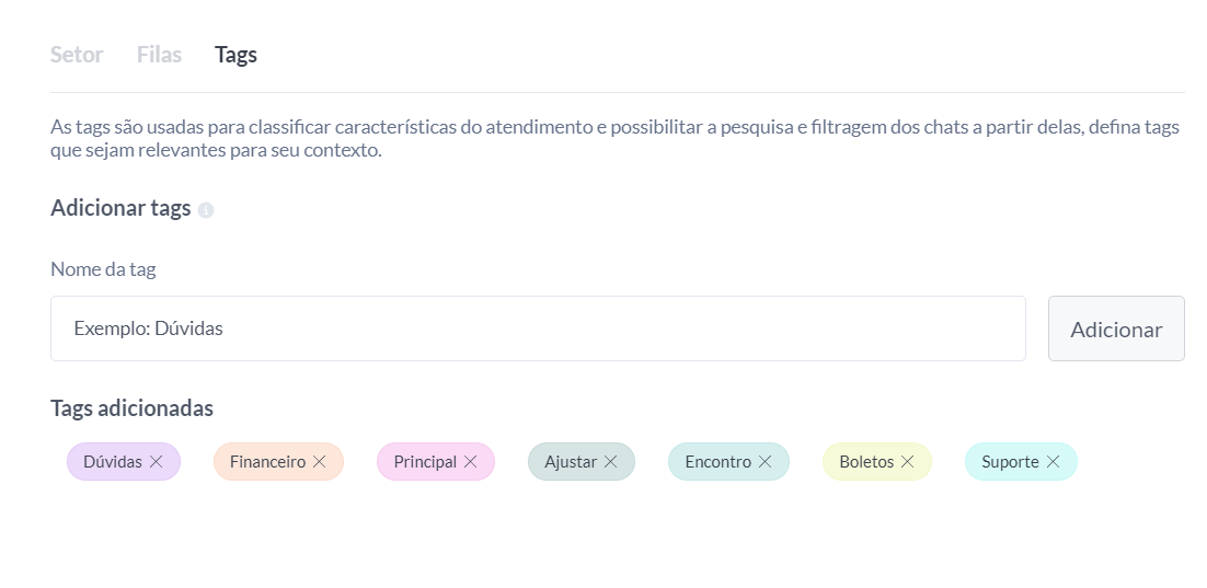 As tags são usadas para classificar características do atendimento e possibilitar a pesquisa e filtragem dos chats a partir delas, ao encerrar um chat o agente utilizará as tags para classificar o chat de acordo com assunto e outras características.