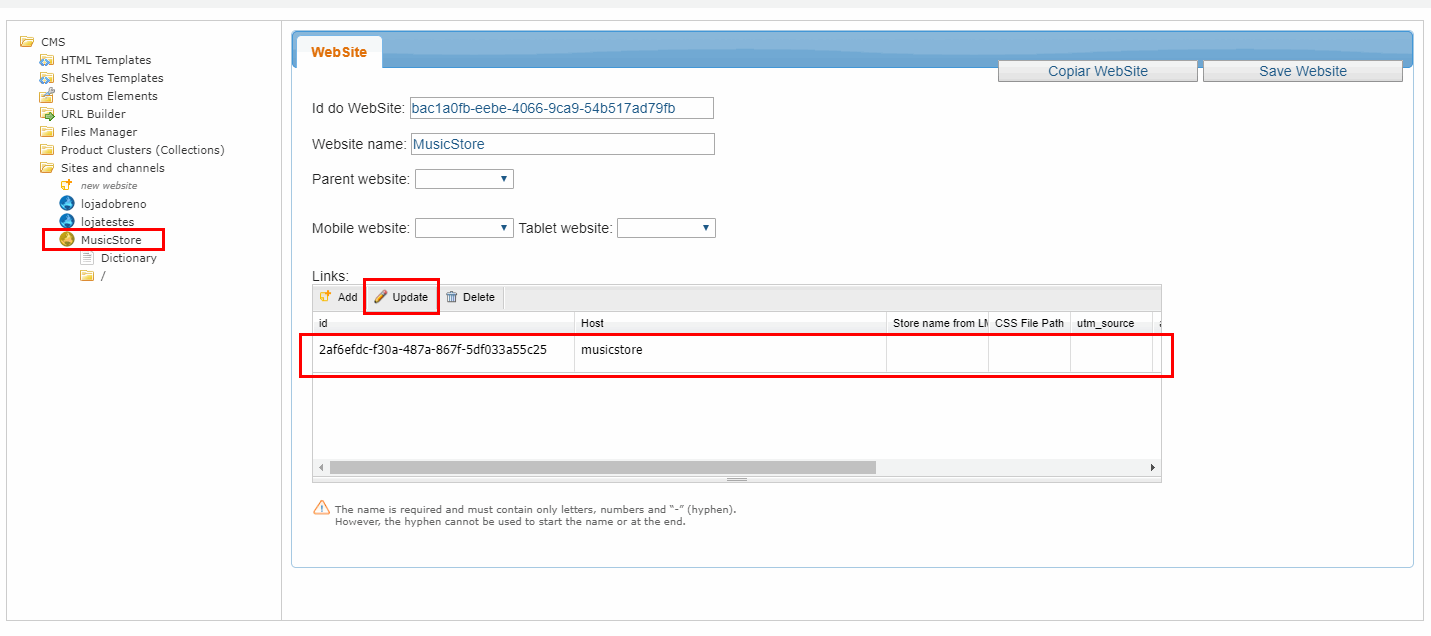 2. Selecione o Binding (linha selecionada na imagem abaixo), e clique em Update.