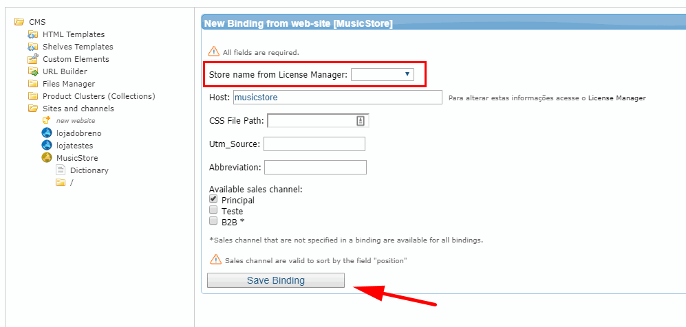 Um ponto que impacta na indexação do produto na loja é o website não estar associado a nenhum Binding.