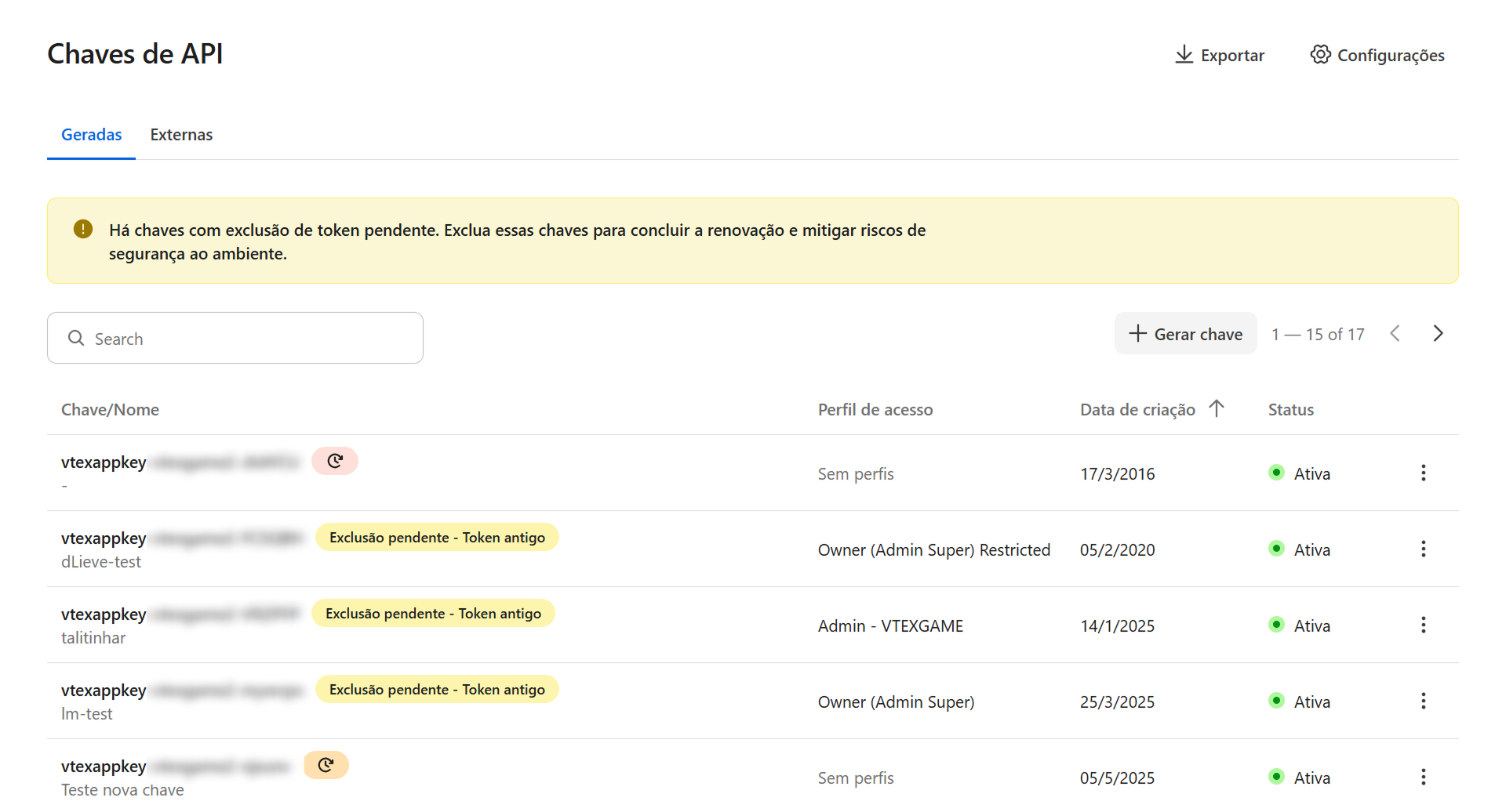 Chaves geradas: permite gerenciar chaves de API criadas e administradas por sua conta VTEX.