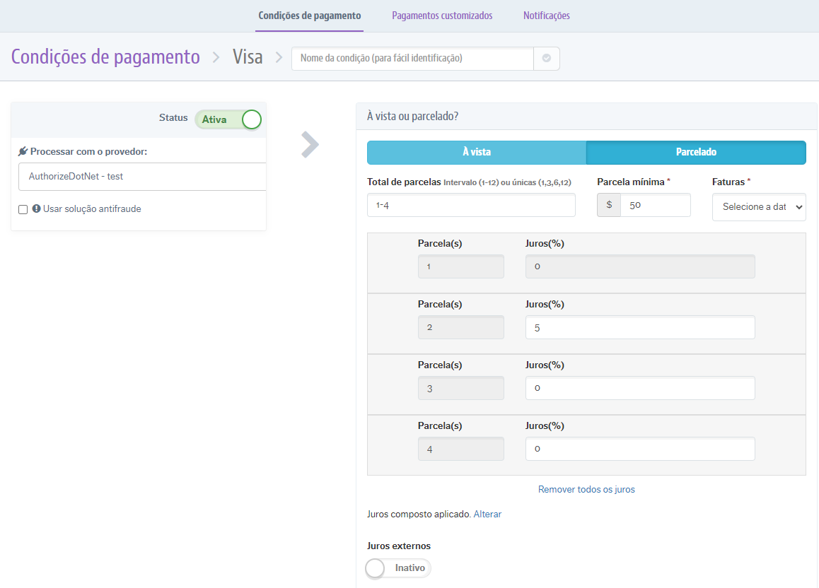 - Indicar em Processar com o provedor, qual provedor irá processar esta condição de pagamento.