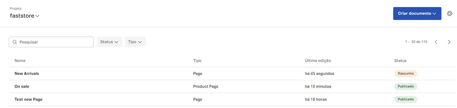 | Criar documento | Cria uma nova página baseada nas opções disponíveis, por exemplo, Product Page ou Home. |