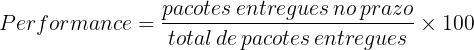 A performance é o resultado em percentual do cálculo entre a relação dos pacotes entregues dentro do prazo pelo total de pacotes entregues. Assim, o cálculo da performance só leva em consideração os pacotes que foram entregues. Veja: