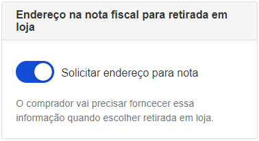 - d. Selecione o do campo Endereço na nota fiscal para retirada em loja.> ⚠️ A opção de Endereço na nota fiscal para retirada em loja deve estar habilitada em todas as lojas do Brasil, pois é num requisito que a Nota Fiscal emitida contenha a informação do endereço do cliente, mesmo que a opção de entrega do pedido seja no ponto de retirada. O endereço preenchido pelo cliente será registrado no campo