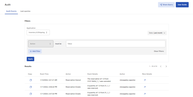 Action = Change Promotion ConfigurationorChange Coupon Configuration), the results include events that match any of the values entered. When adding filters with different parameters (for example:Action = Change Coupon ConfigurationandAuthor = email@mail.com), the criteria are combined. Note that you can repeat steps 4 and 5 to add more filters.For example, the query in the image below returns results for