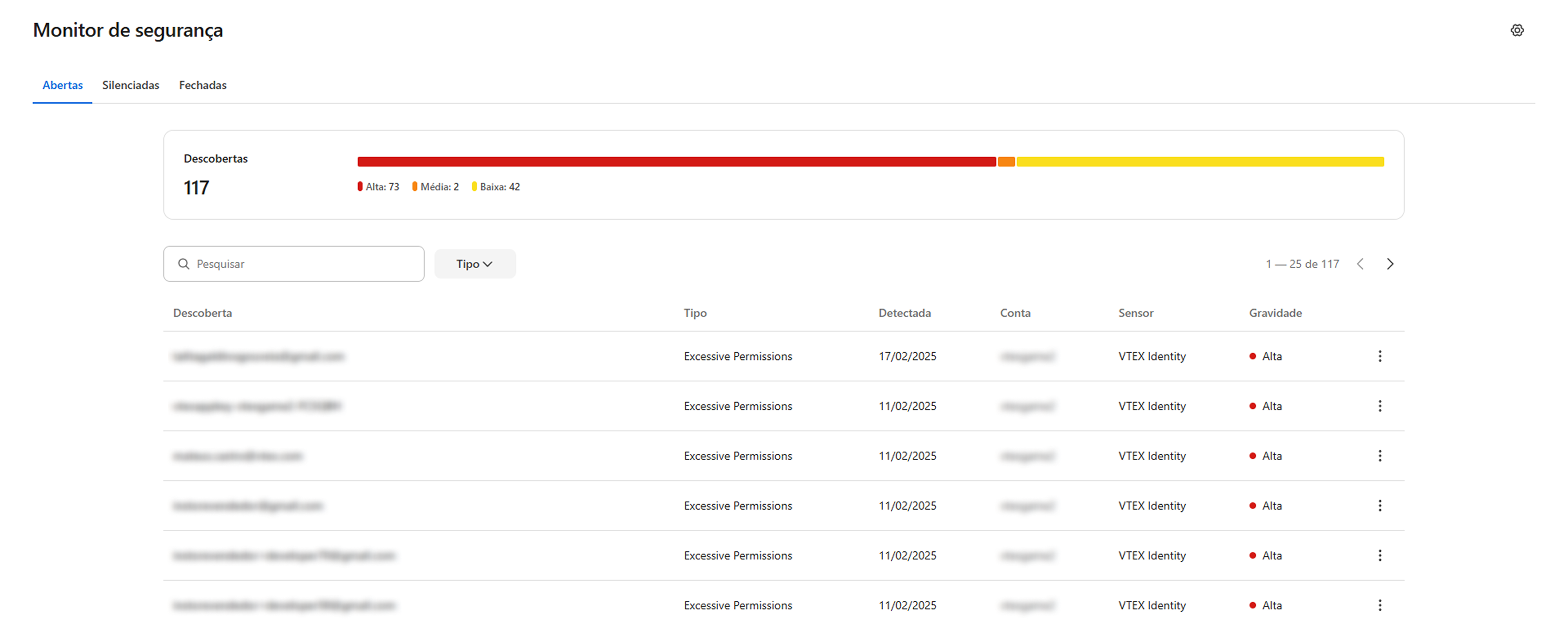 A aba Silenciadas apresenta a listagem de descobertas que foram silenciadas em uma tabela, com as mesmas informações descritas na aba Abertas.