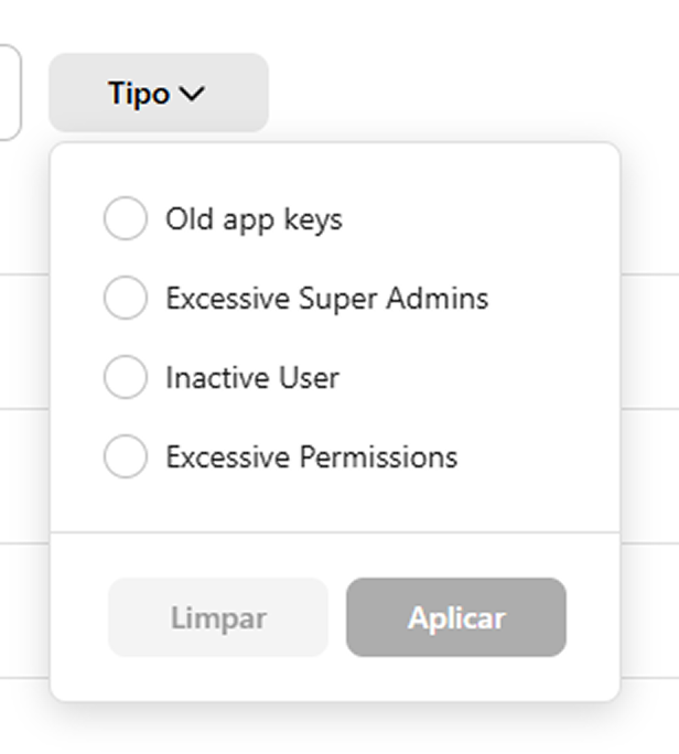 Ao clicar em Tipo, você pode escolher um dos tipos de descoberta para filtrar os resultados exibidos na listagem. Clique em Aplicar para confirmar o filtro escolhido e a listagem será atualizada.